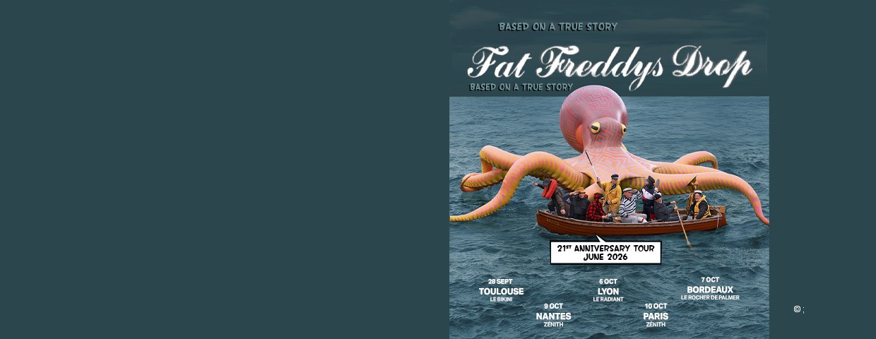 Les légendaires Fat Freddy’s Drop reviennent sur scène en 2026 pour une tournée mondiale exceptionnelle célébrant leur album culte Based On A True Story. Plus de vingt ans après sa sortie, ce disque fondateur continue d’inspirer des générations de fans grâce à son mélange unique de reggae, soul, dub, funk et groove électronique. Le groupe donnera 5 dates en France à l’automne : le 28 septembre au Bikini à Toulouse, le 6 octobre au Radiant à Lyon, le 7 octobre au Rocher de Palmer à Bordeaux, le 9 octobre au Zénith de Nantes et le 10 octobre au Zénith Paris - La Villette.